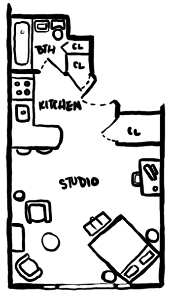I figure Steve’s apartment is your run of mill Pre-war building studio apartment. With fun 15 foot ceilings! Here’s a floor plan, because I’m a dork with way too much free time. (Based off of a friend’s apartment.)
